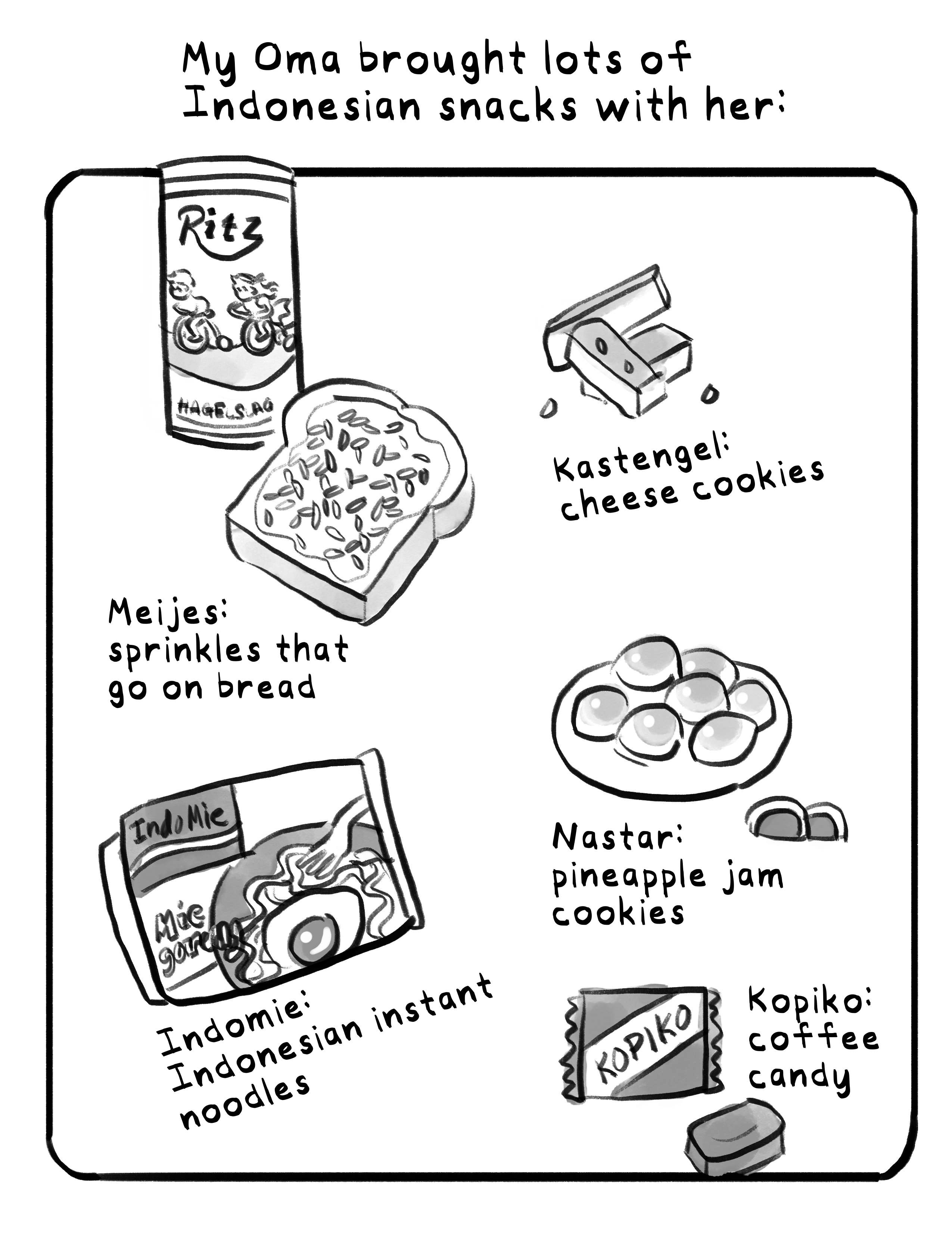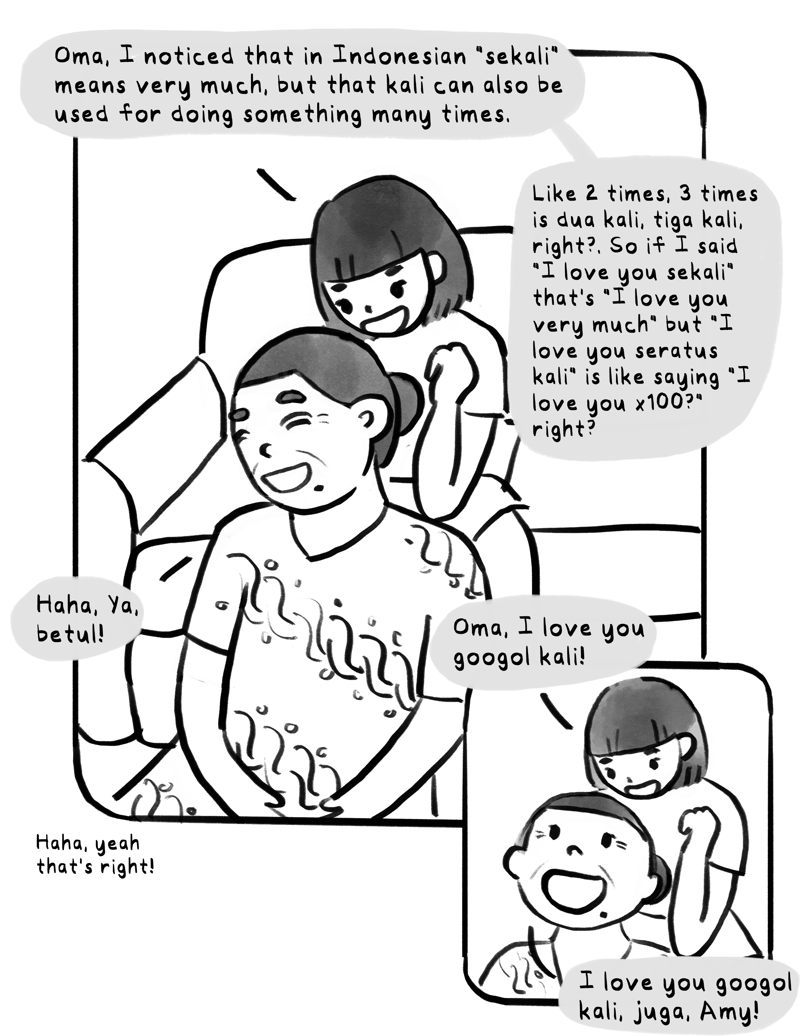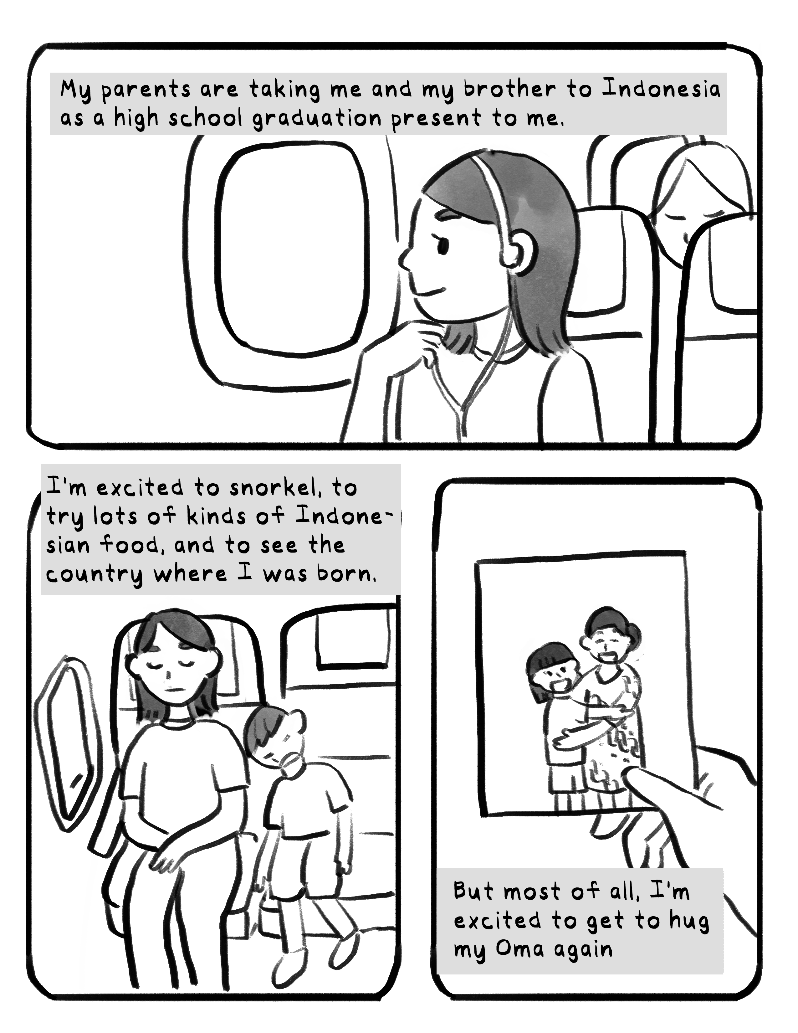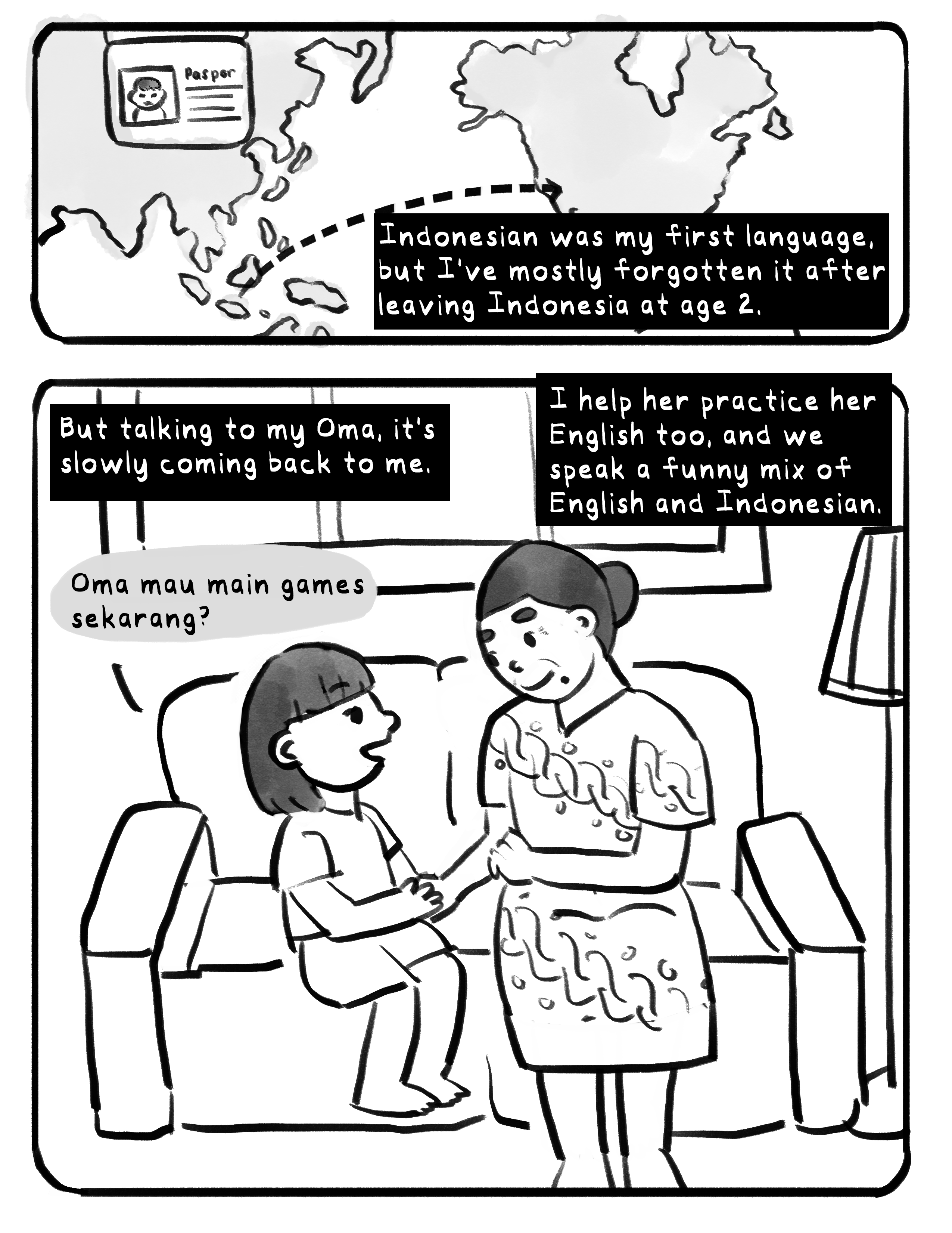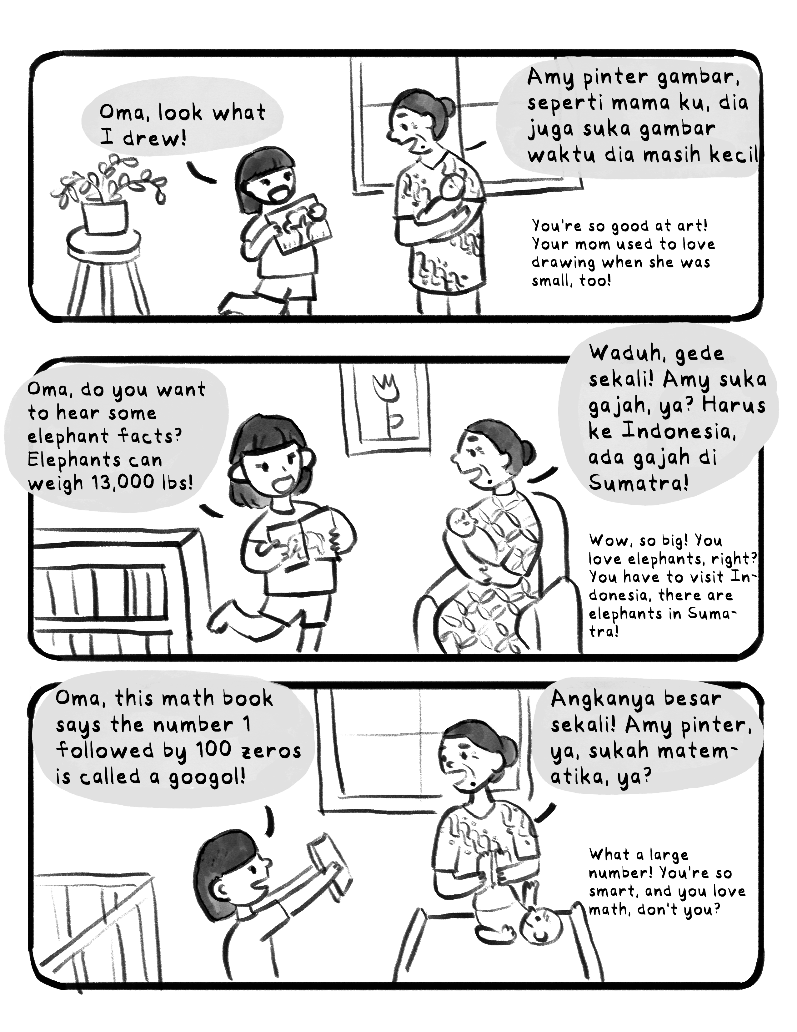 Summer with Oma is a comic about the summer that my grandma came from Indonesia to the US to live with our family for 3 months. I had left Indonesia as a baby, so this was my first ever memory of spending time with my grandmother.